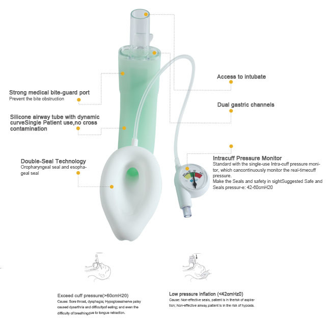 قناع حنجري مزدوج التجويف من السيليكون مع مؤشر ضغط داخل الكفة